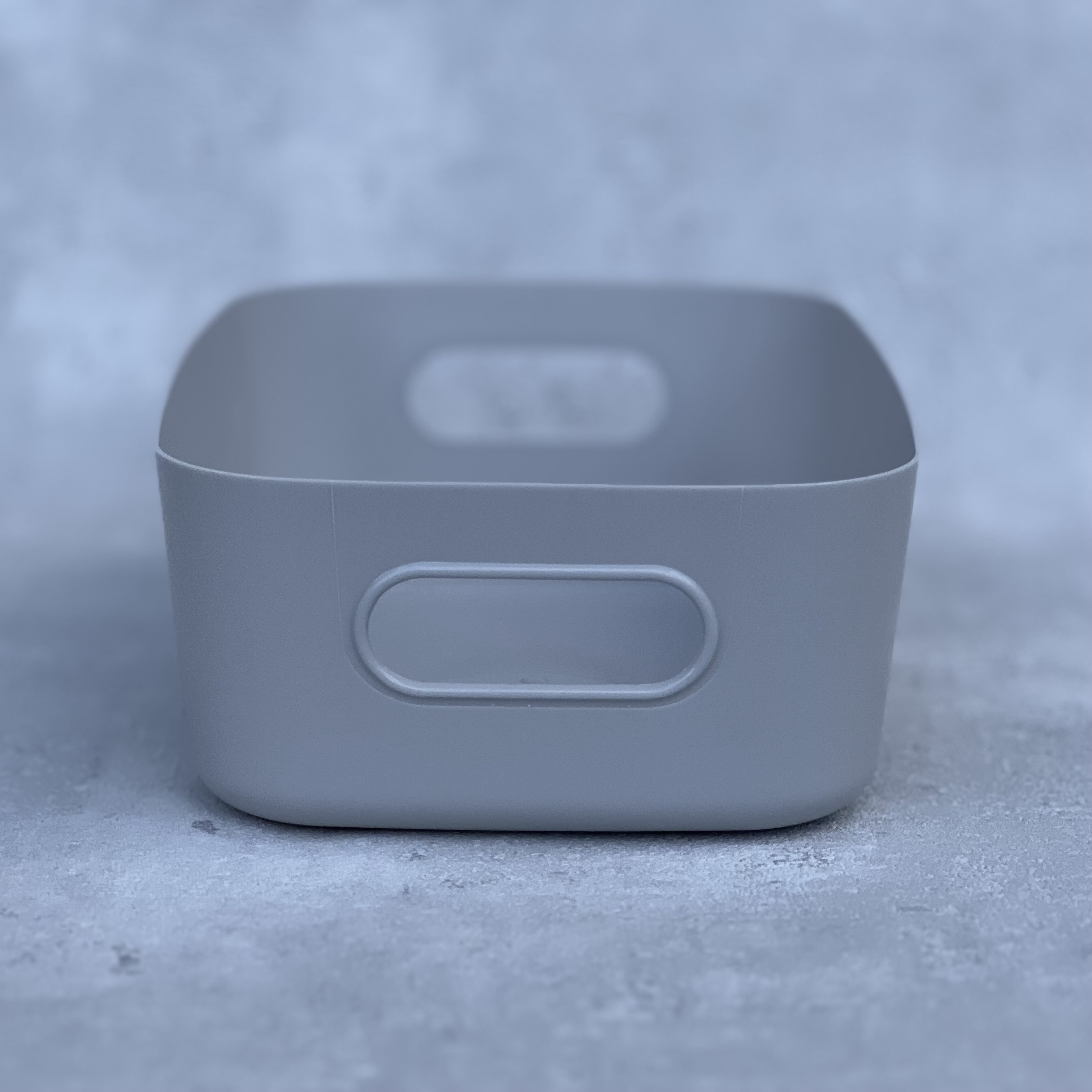 světle šedý úložný box z plastu.